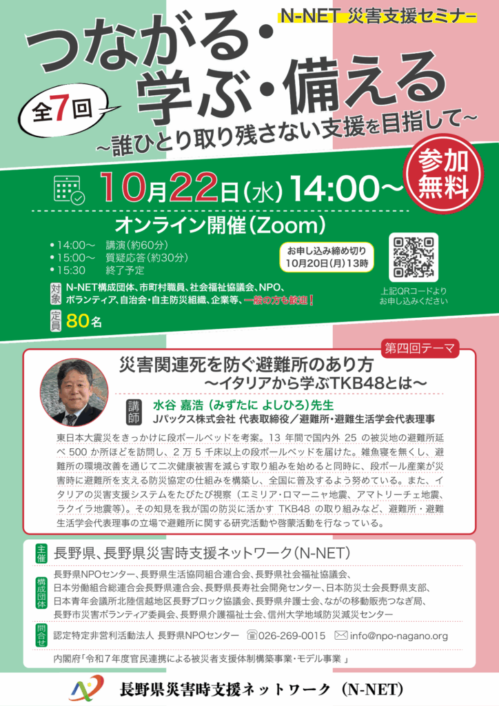 長野県災害時支援ネットワーク(N-NET)では、災害時における被災者支援の質を高めることを目的に、全7回の災害支援セミナーを開催しています。