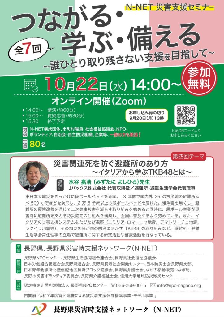 【参加者募集】N-NET災害支援セミナー「つながる・学ぶ・備える」第4回テーマ「災害関連死を防ぐ避難所のあり方 ~イタリアから学ぶTKB48とは~」