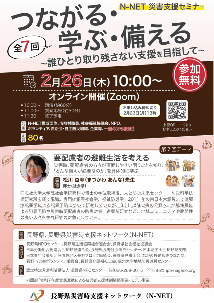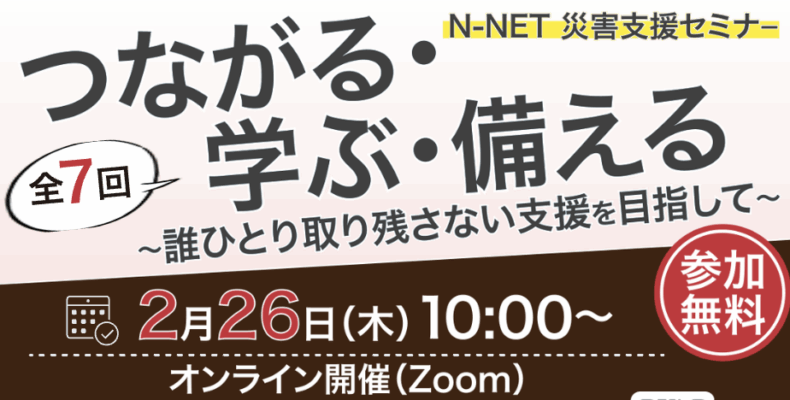 【参加者募集】N-NET災害支援セミナー「つながる・学ぶ・備える」第7回テーマ「要配慮者の避難生活を考える」